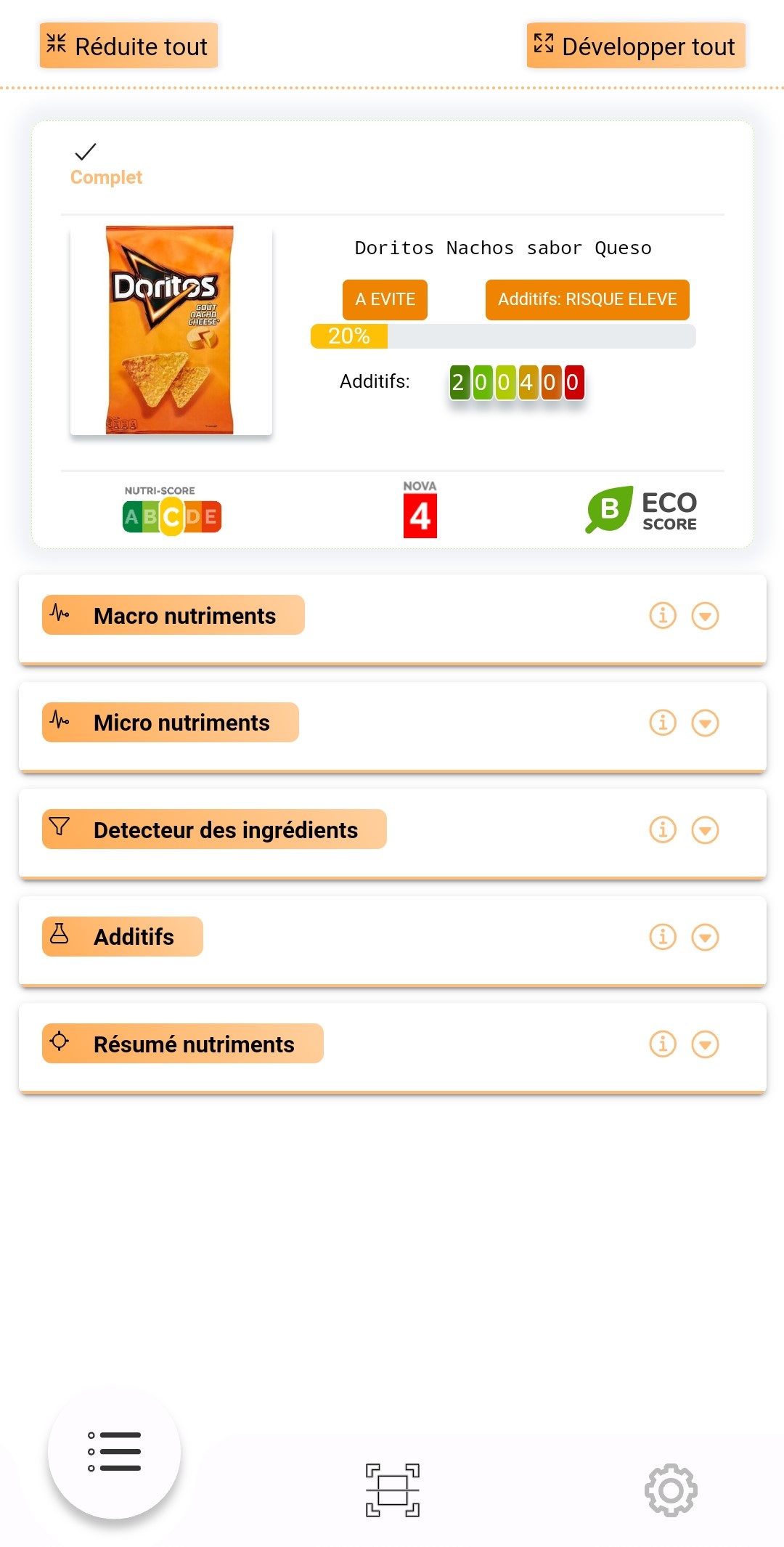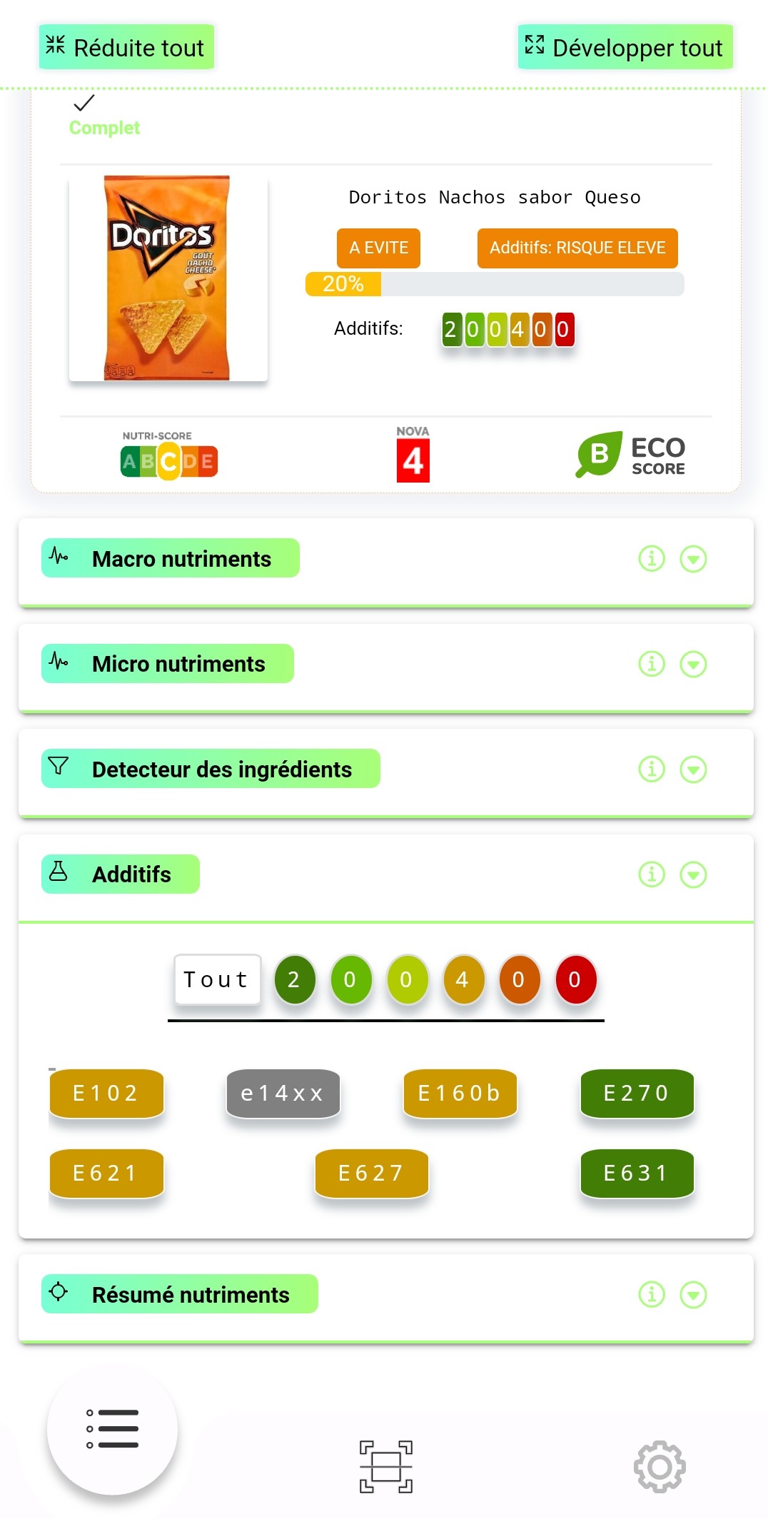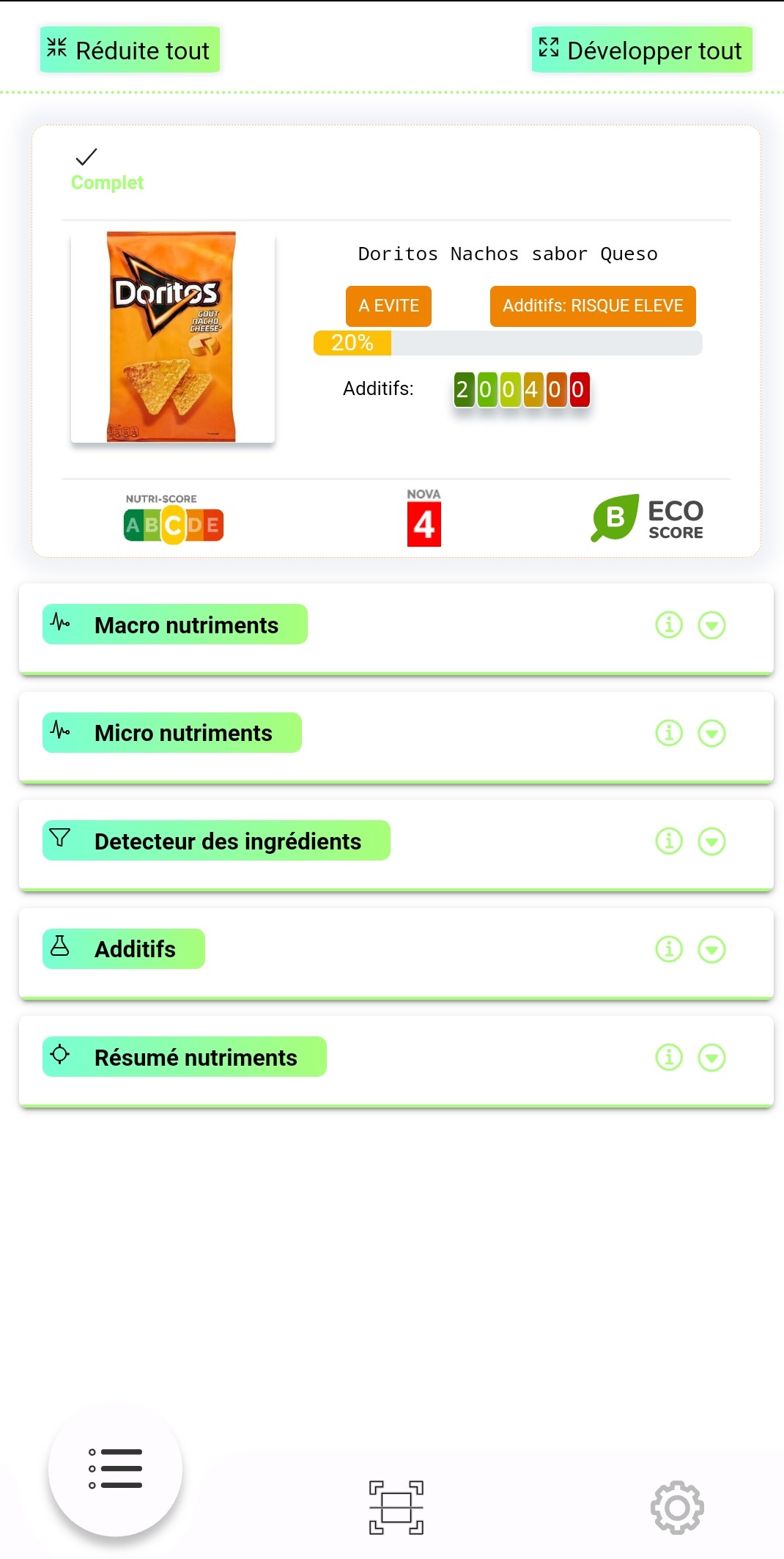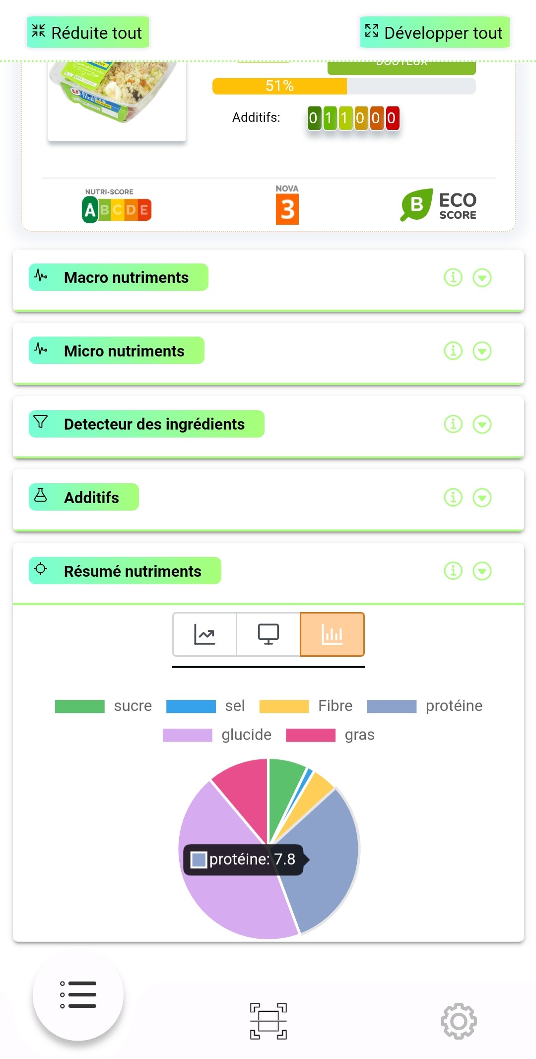 Évaluation du produit en pourcentage, évaluation des additifs, le Nutri-score, le score de transformation Nova, le score pour l’environnement éco-score et bien plus ...
