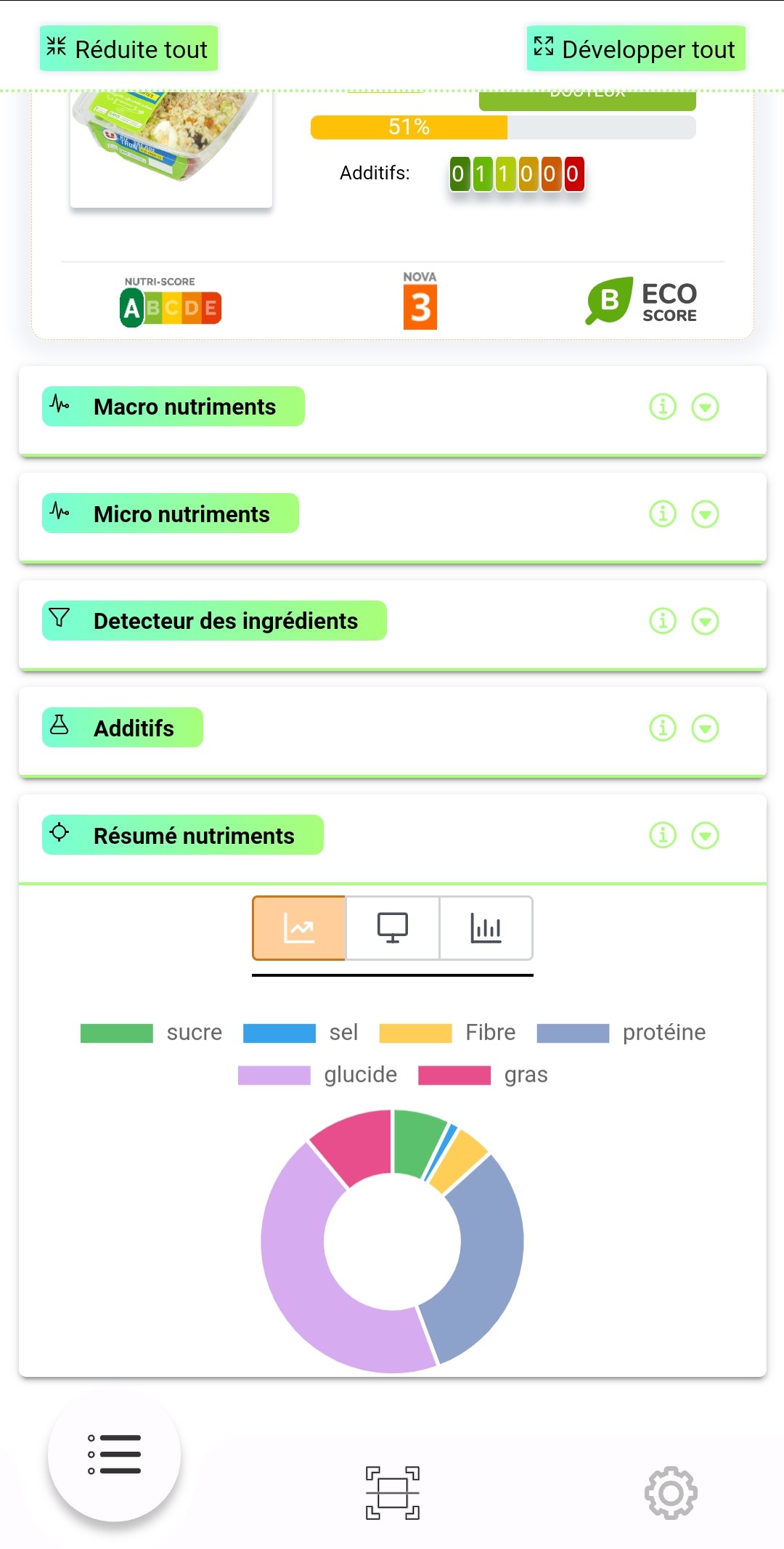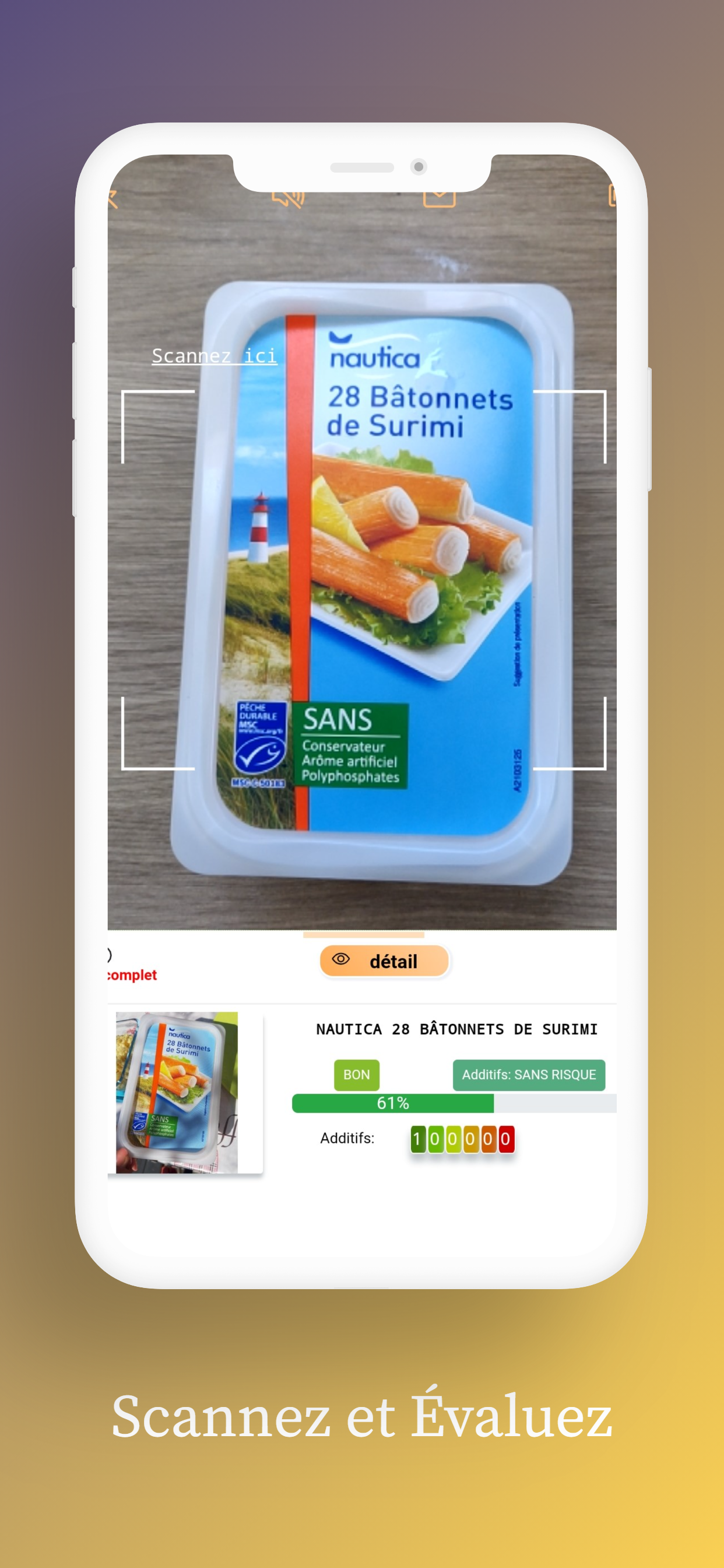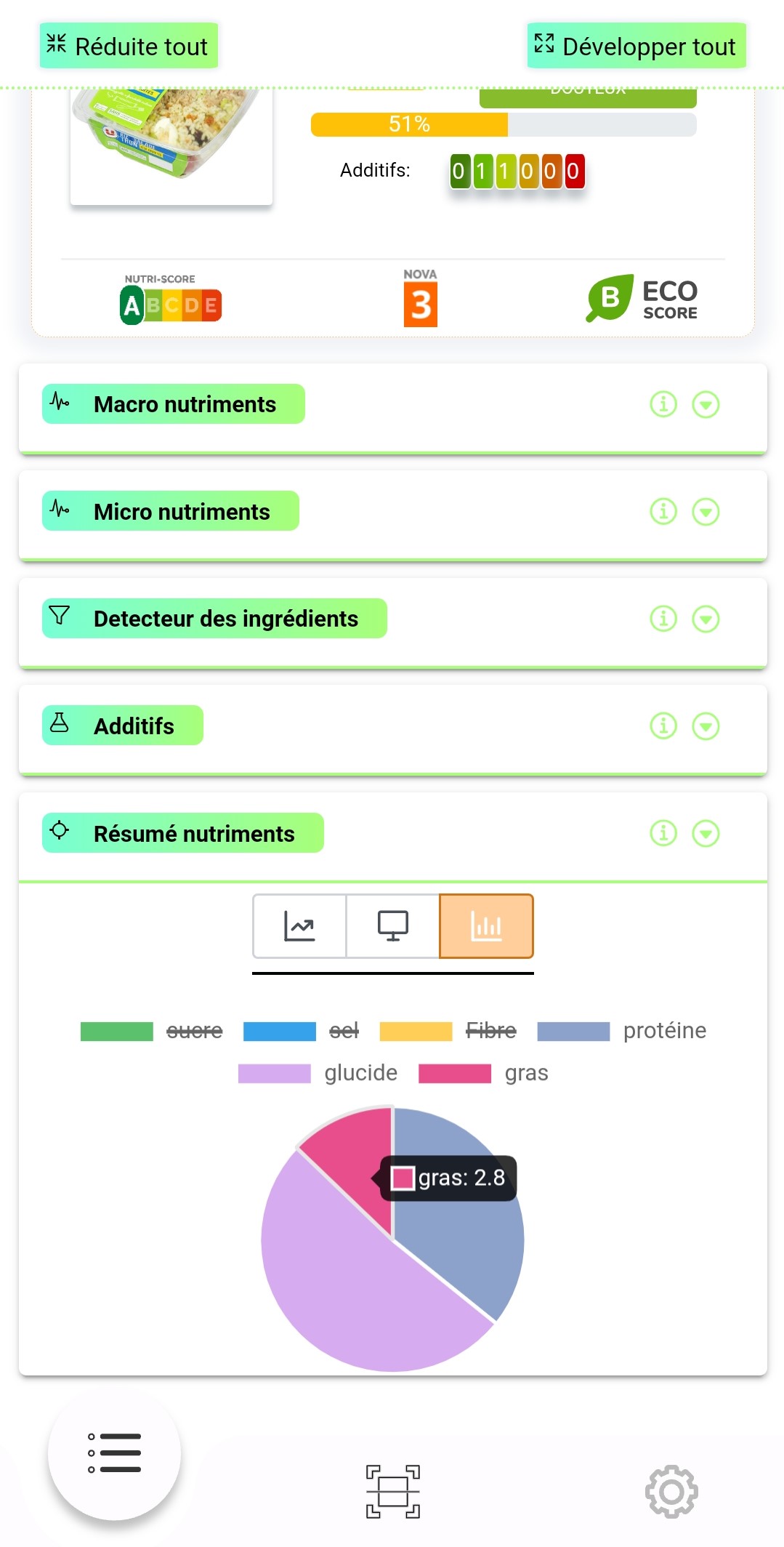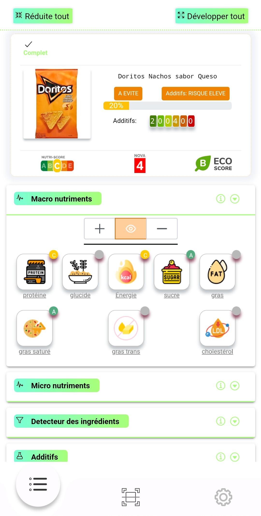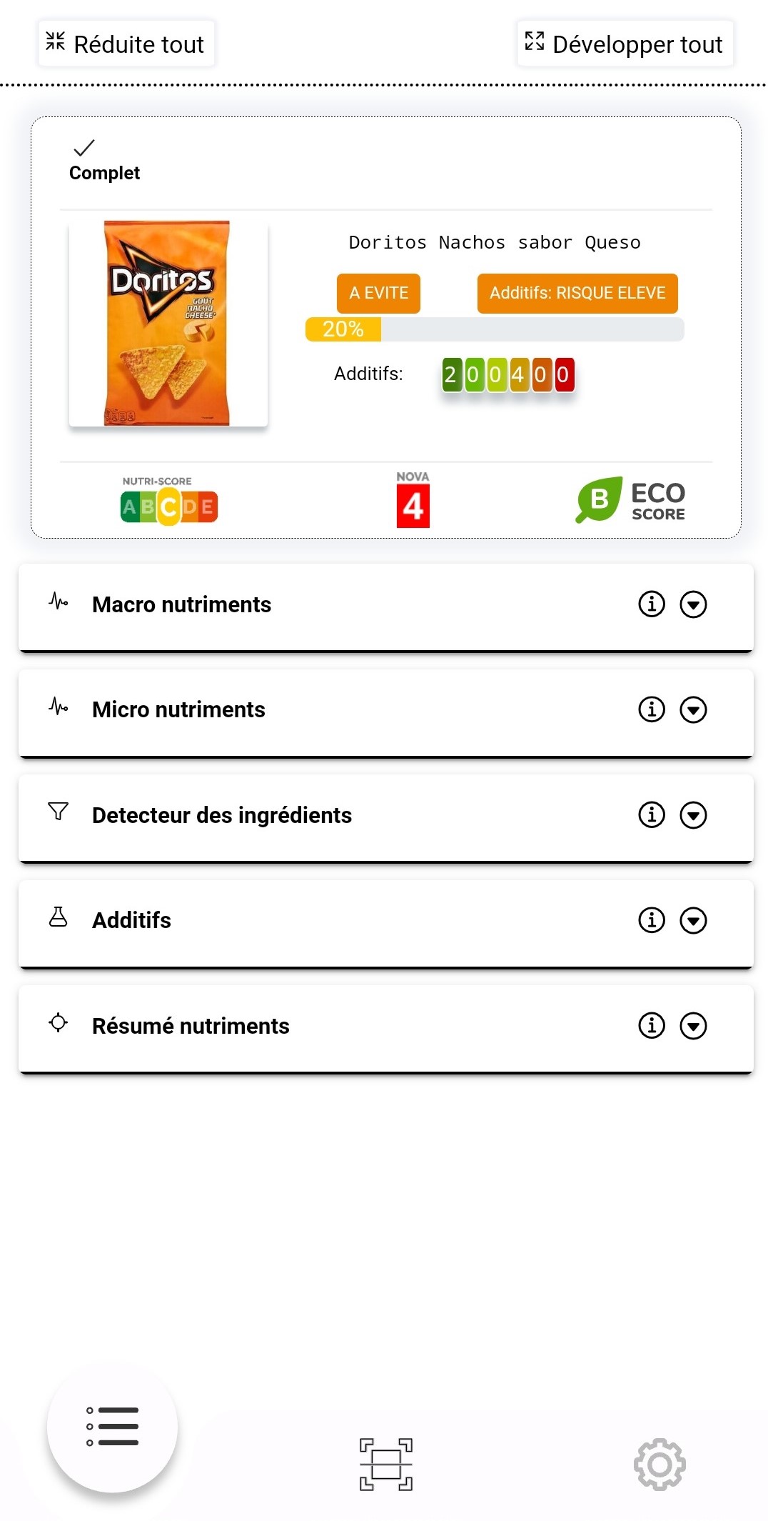 Évaluation du produit en pourcentage, évaluation des additifs, le Nutri-score, le score de transformation Nova, le score pour l’environnement éco-score et bien plus ...