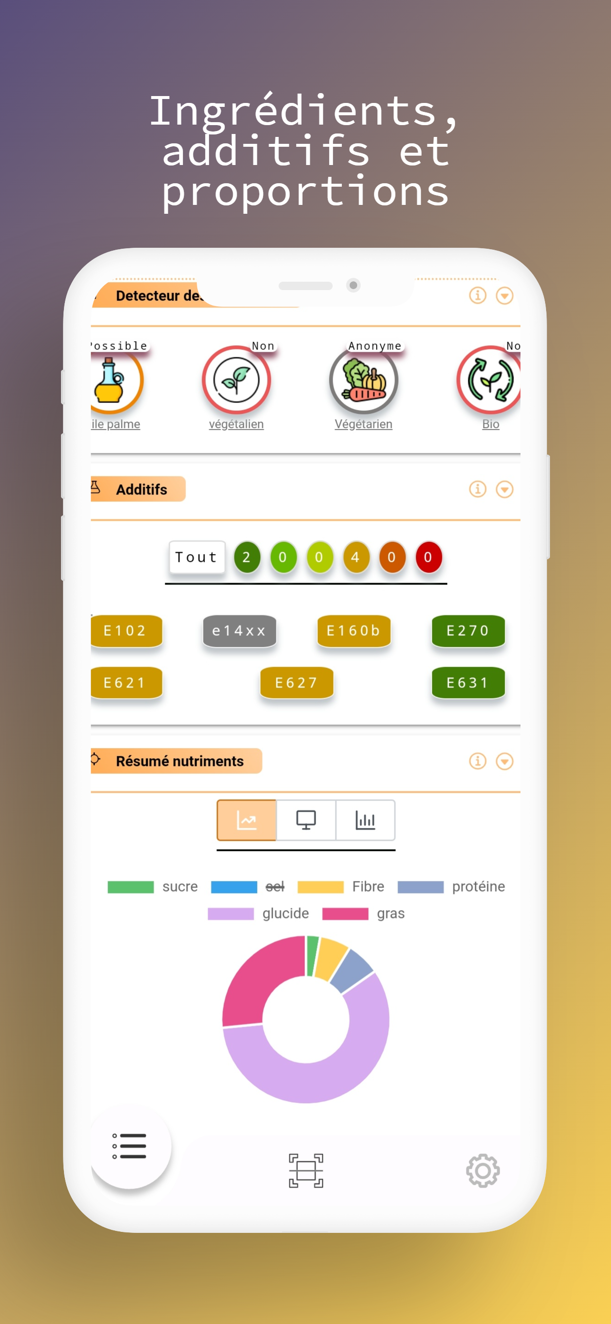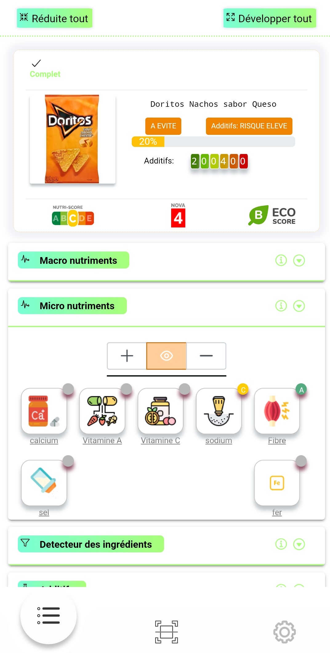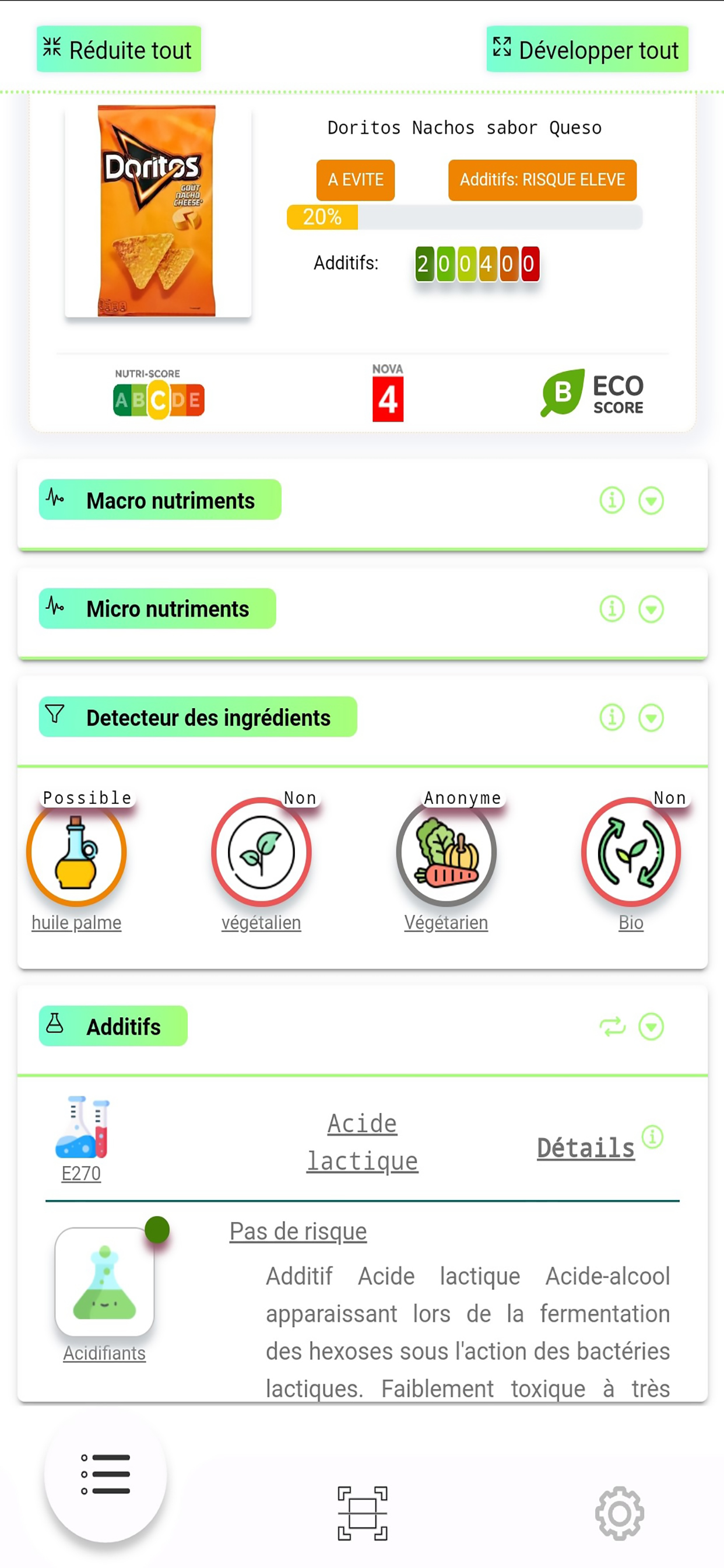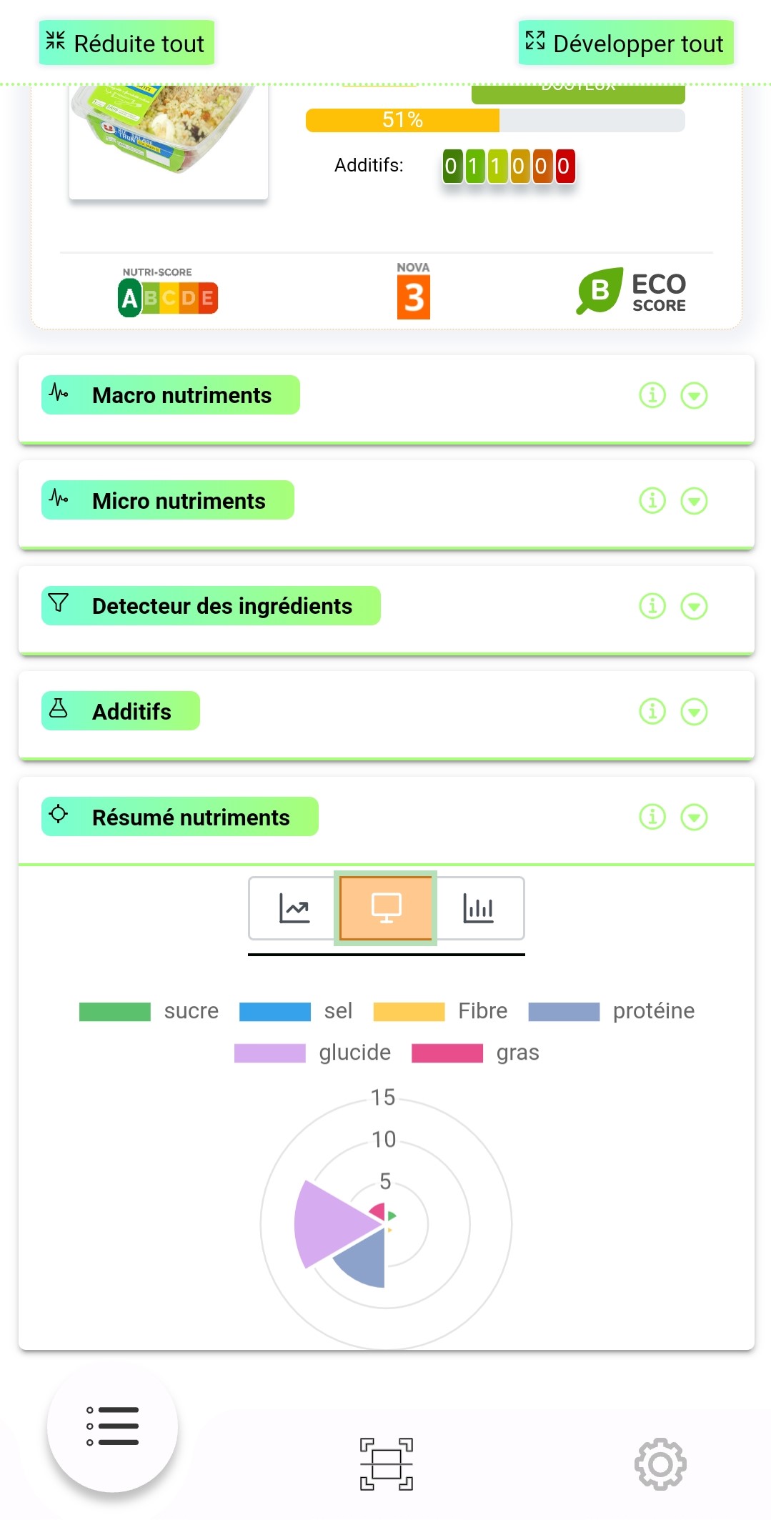 Évaluation du produit en pourcentage, évaluation des additifs, le Nutri-score, le score de transformation Nova, le score pour l’environnement éco-score et bien plus ...