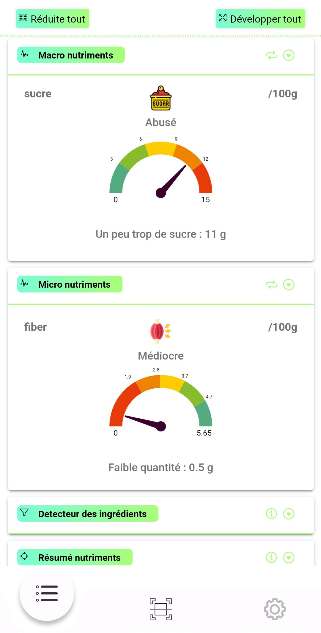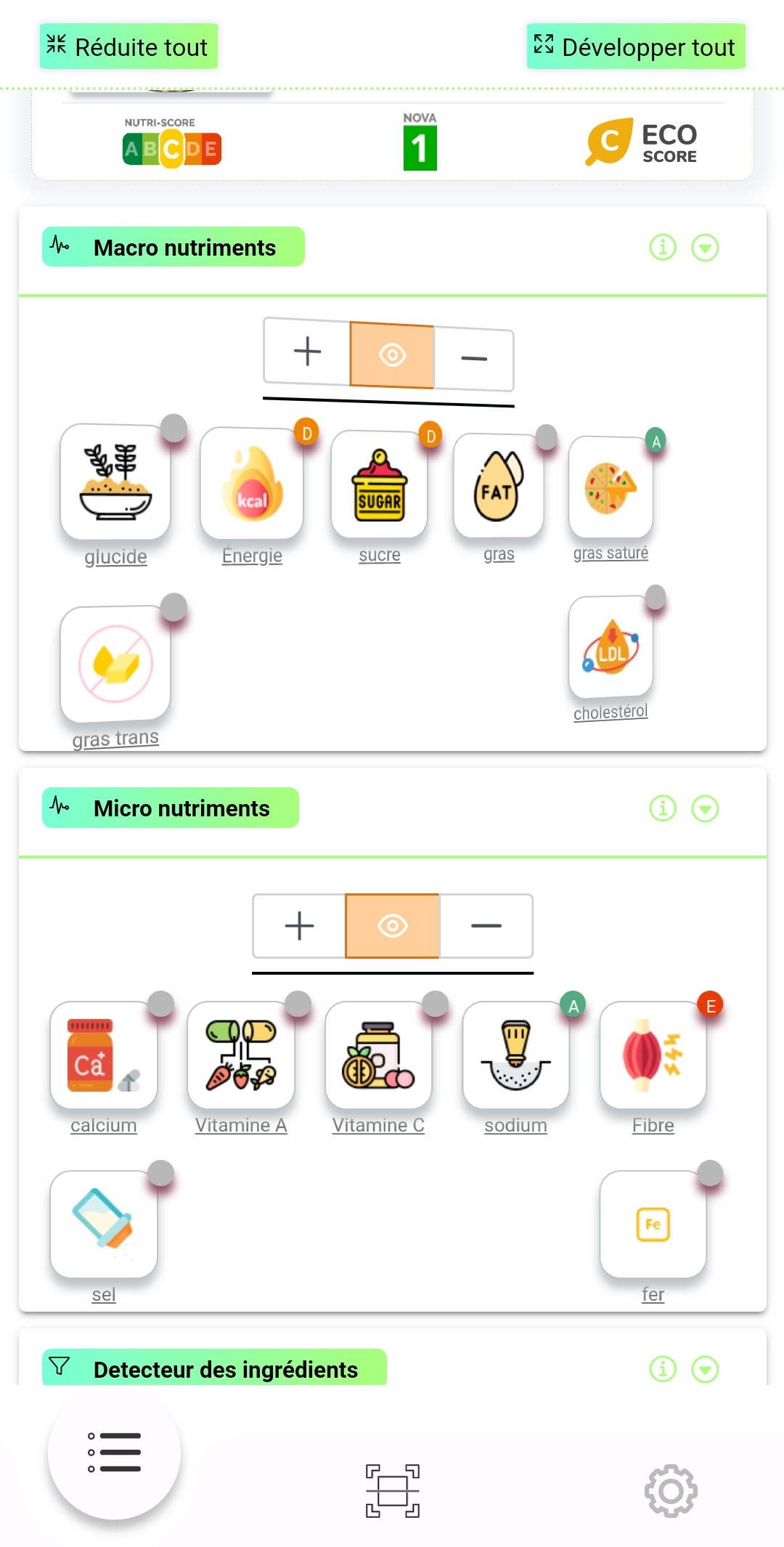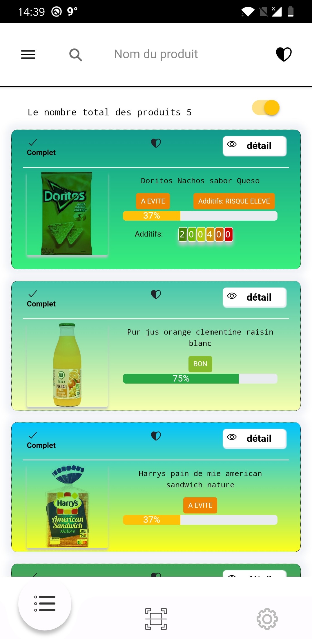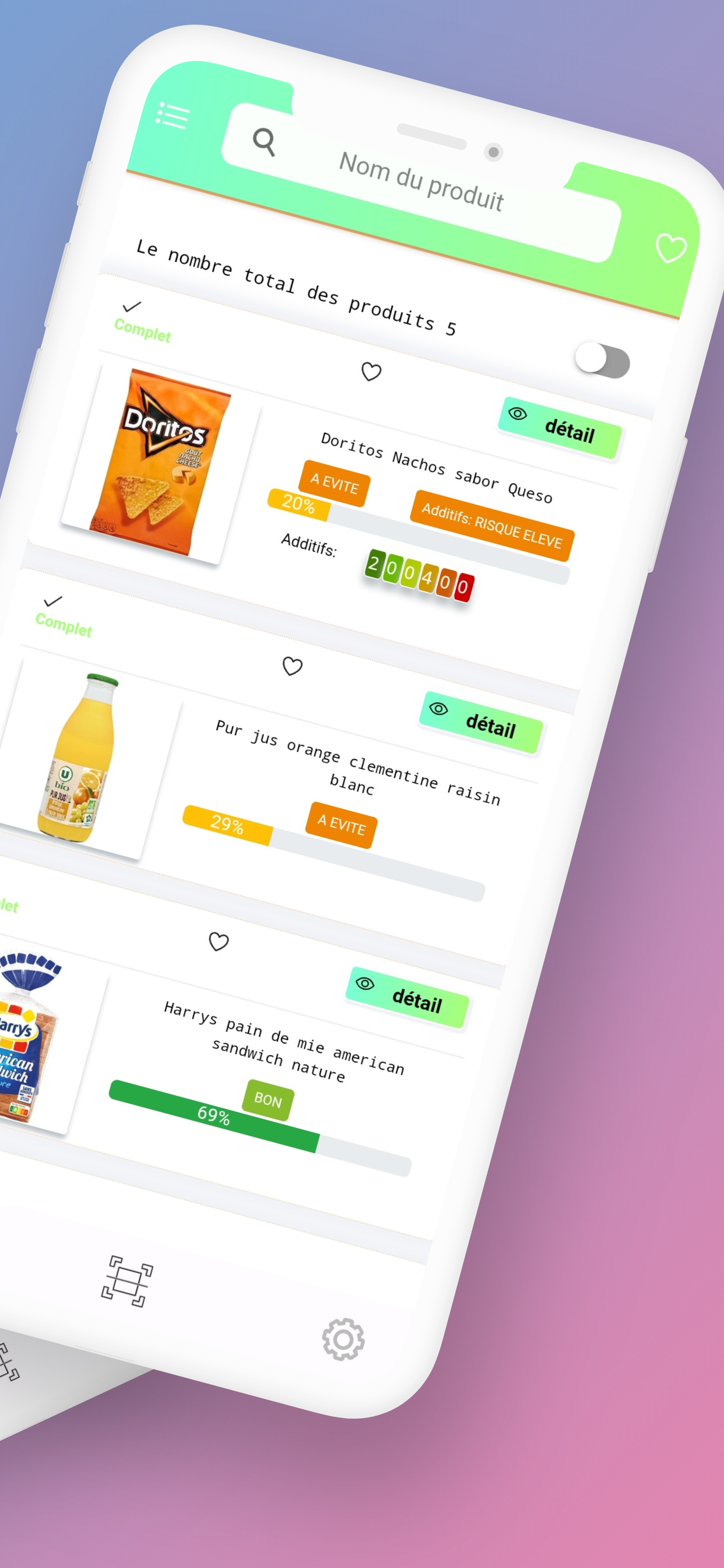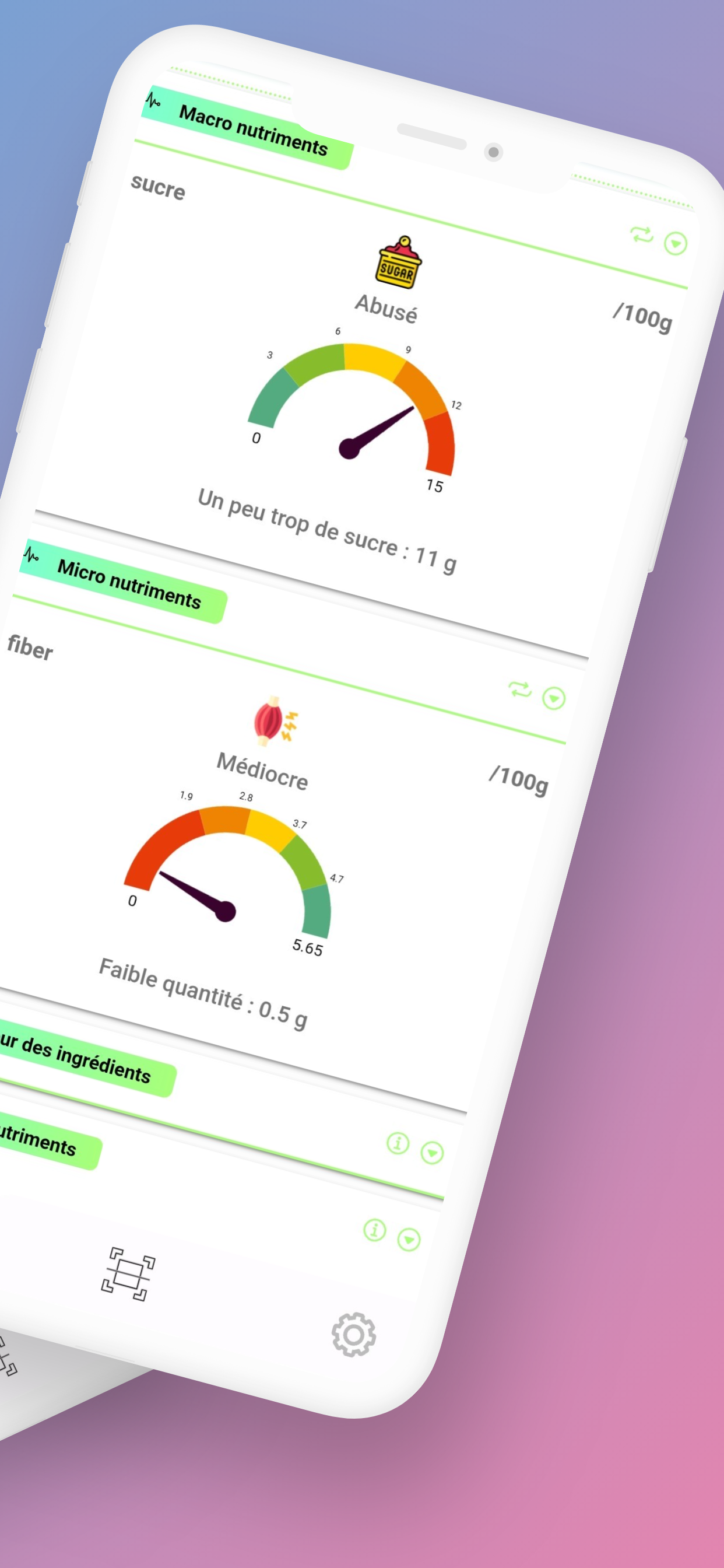 Évaluation du produit en pourcentage, évaluation des additifs, le Nutri-score, le score de transformation Nova, le score pour l’environnement éco-score et bien plus ...