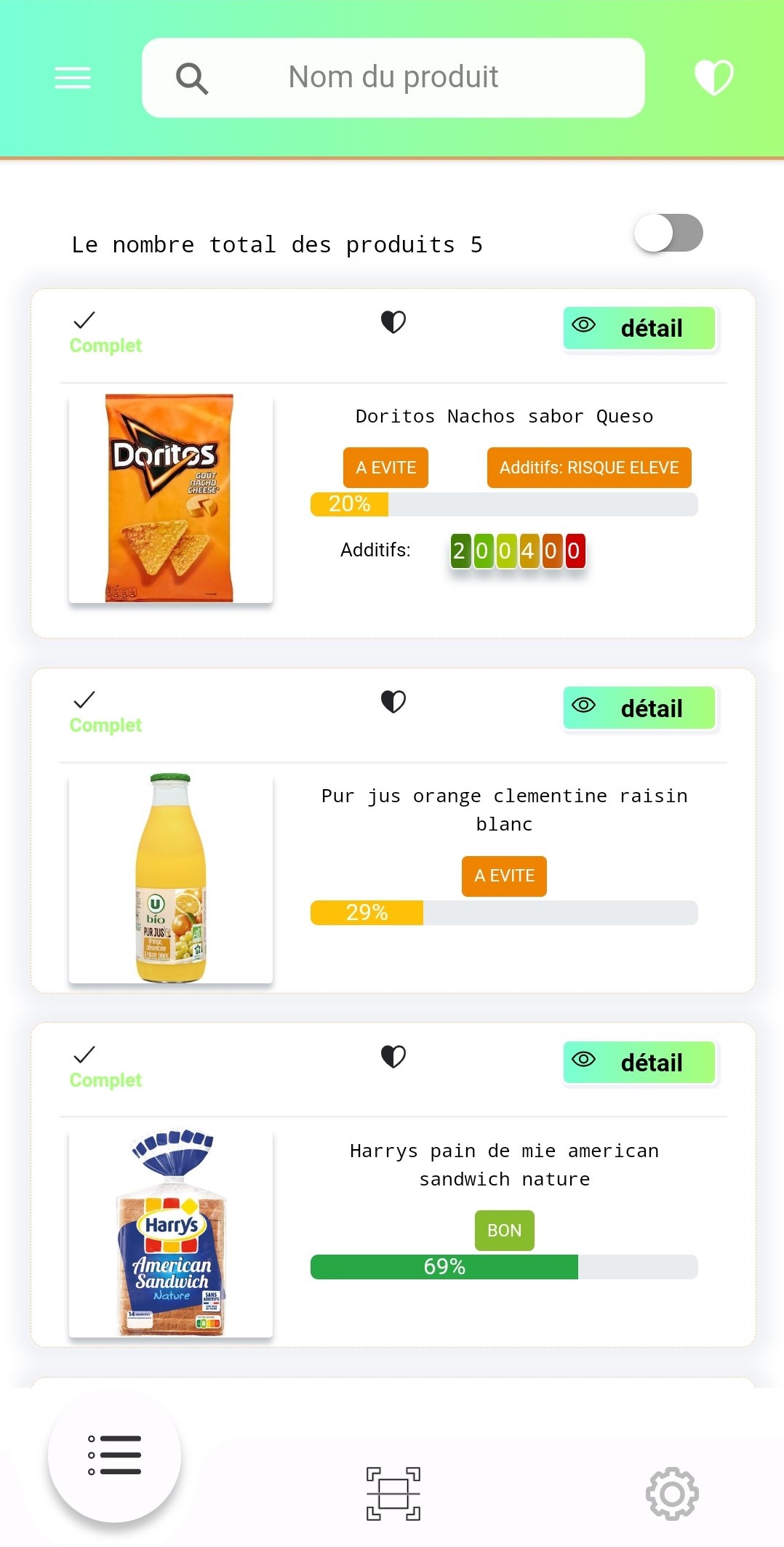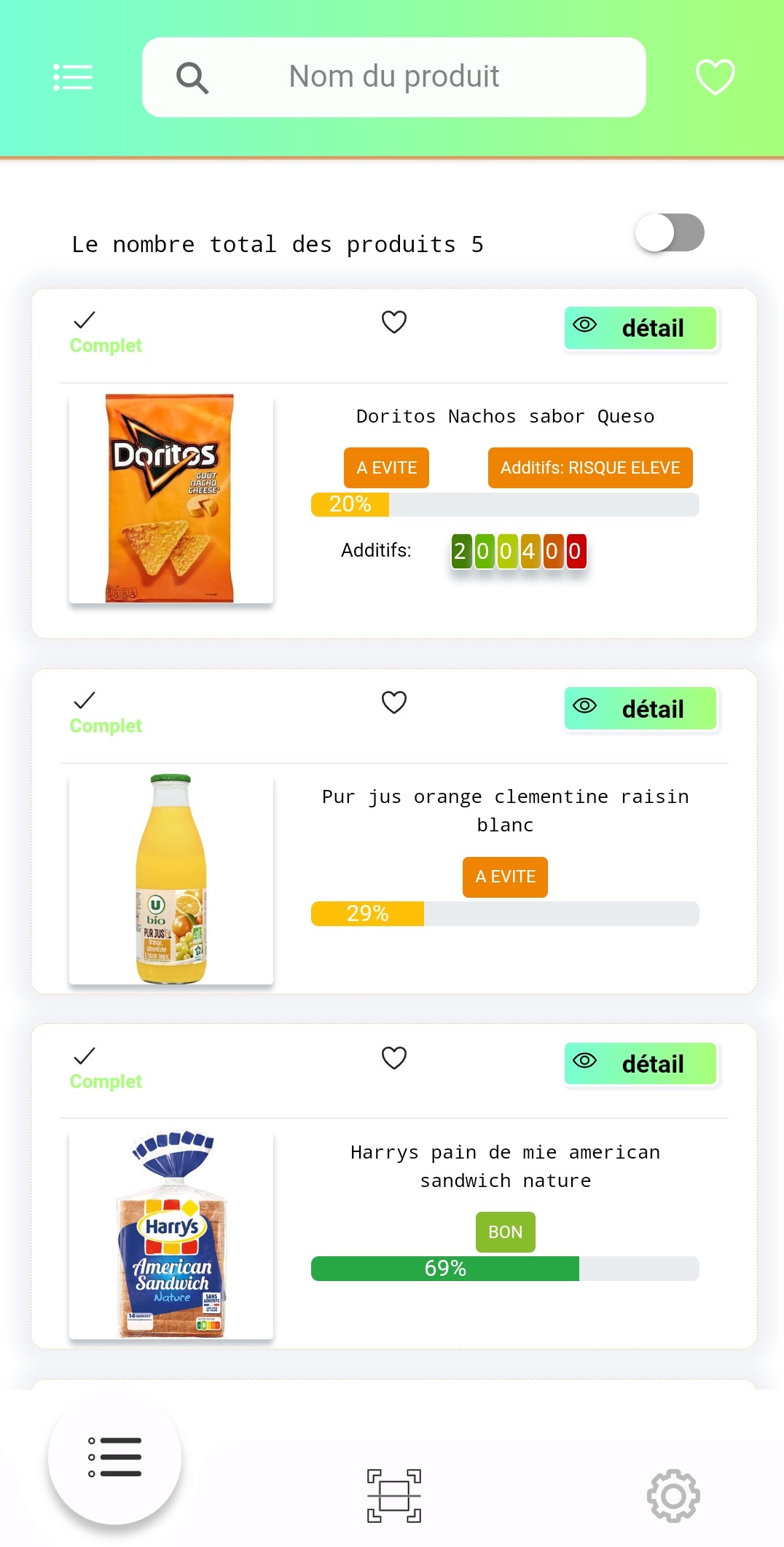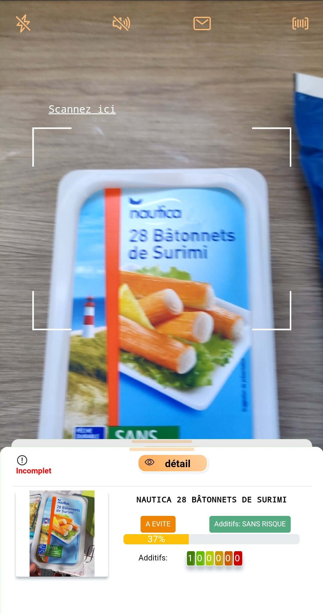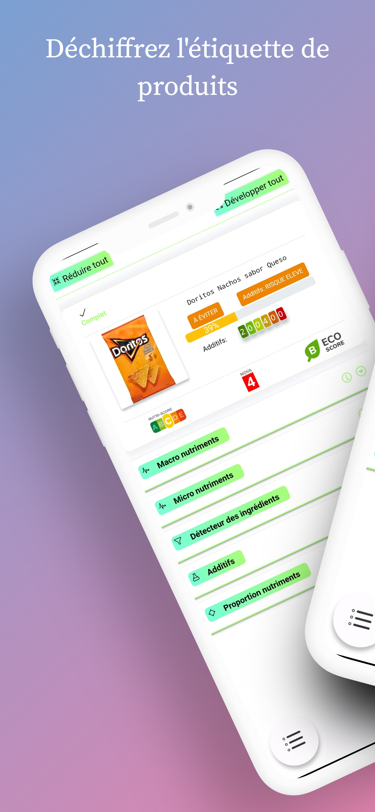 Évaluation du produit en pourcentage, évaluation des additifs, le Nutri-score, le score de transformation Nova, le score pour l’environnement éco-score et bien plus ...
