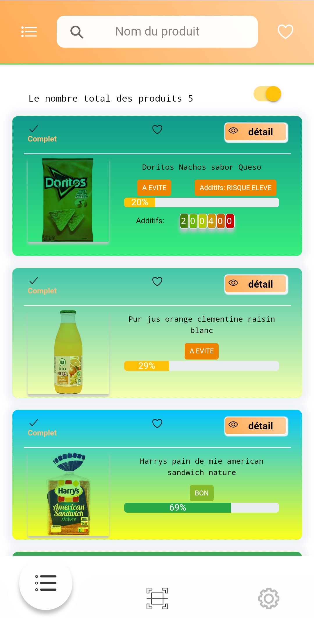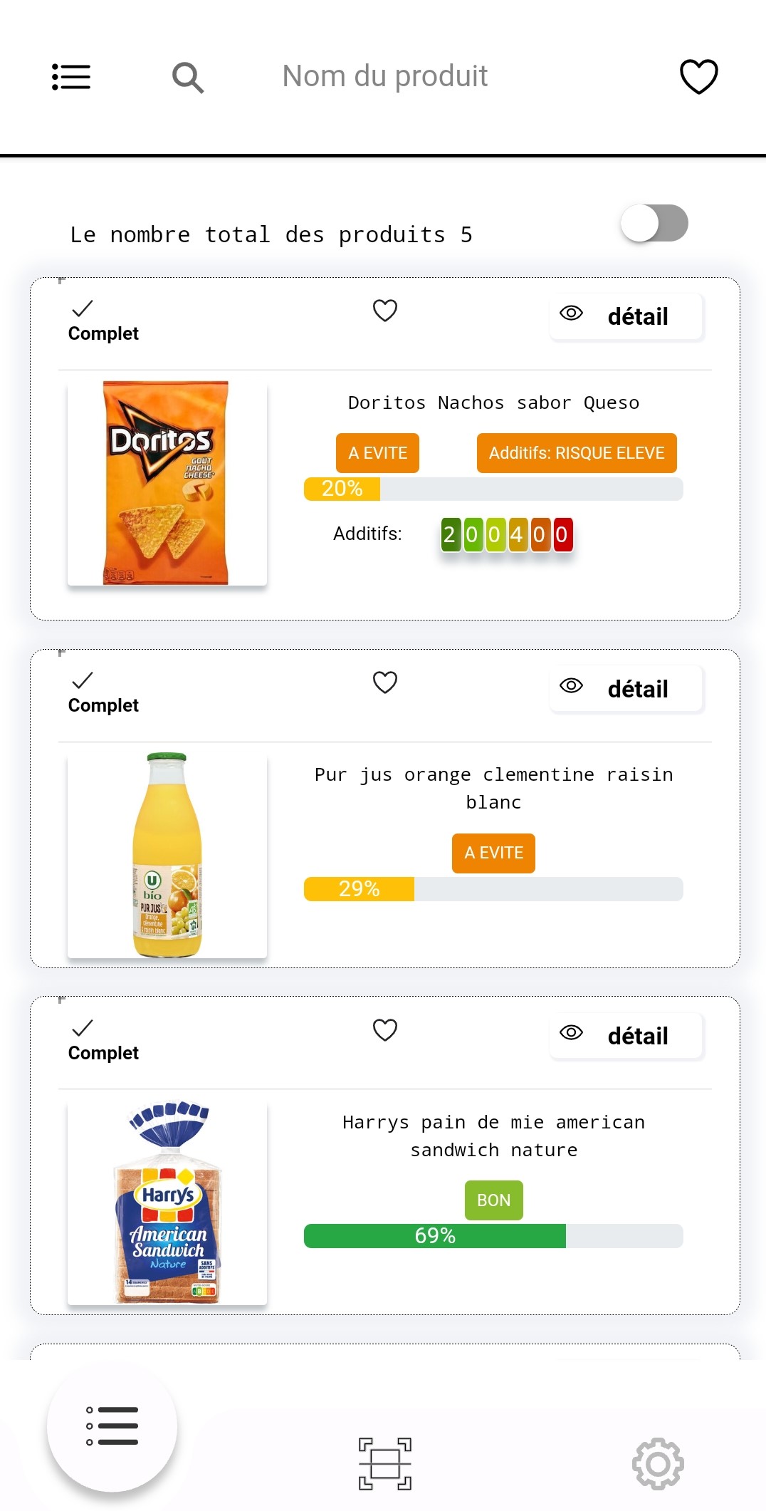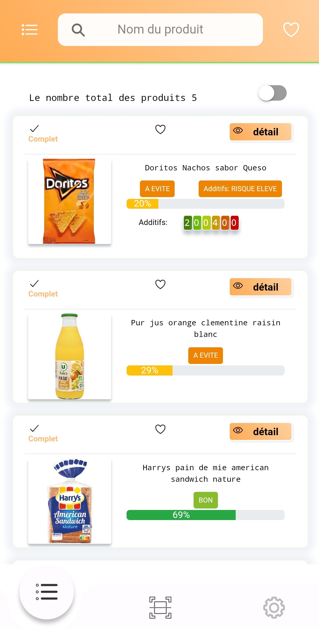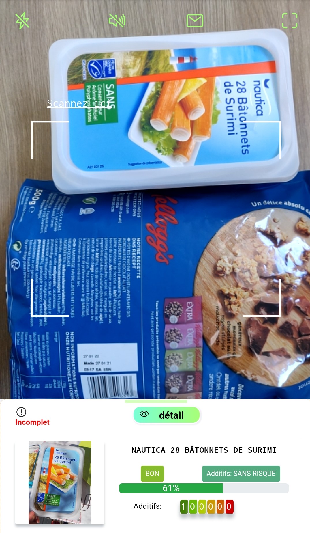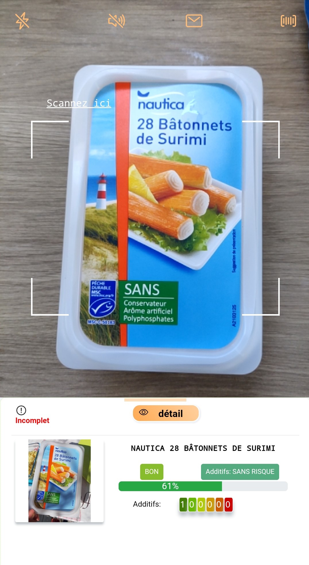 Évaluation du produit en pourcentage, évaluation des additifs, le Nutri-score, le score de transformation Nova, le score pour l’environnement éco-score et bien plus ...