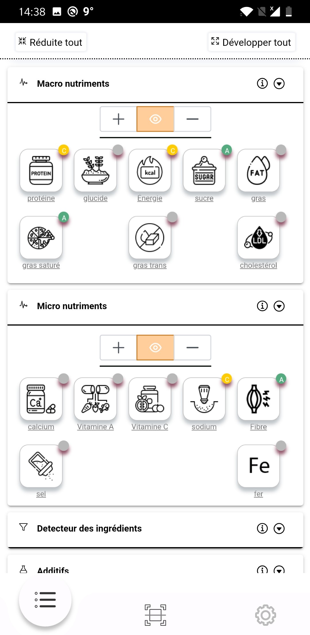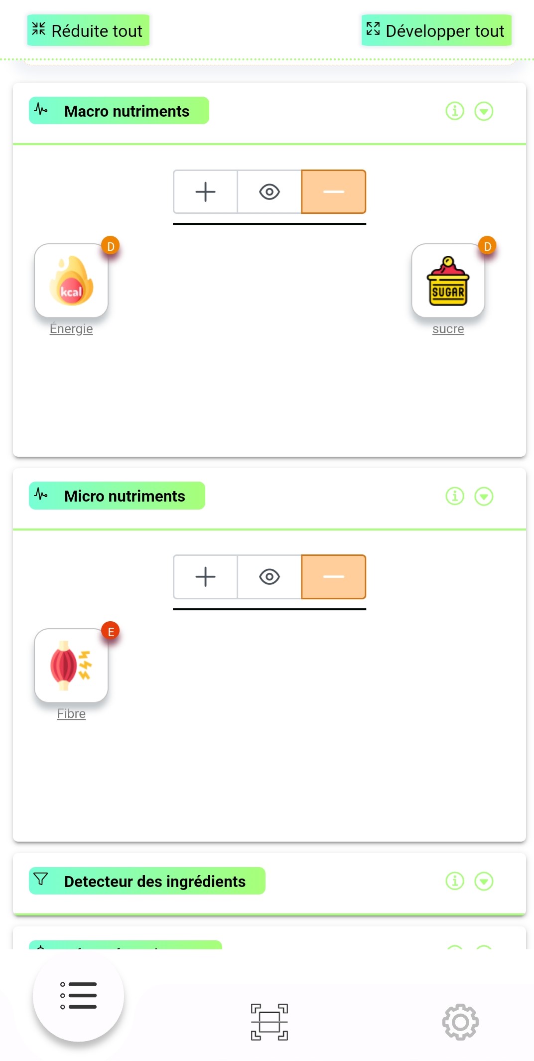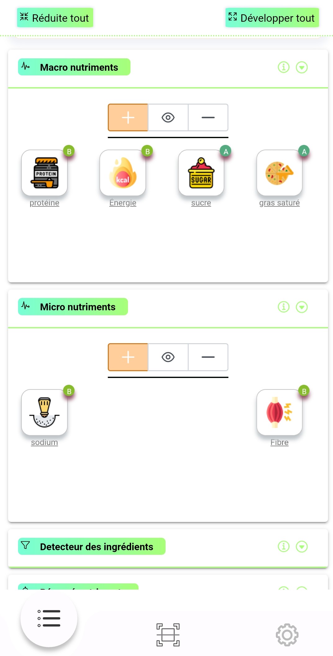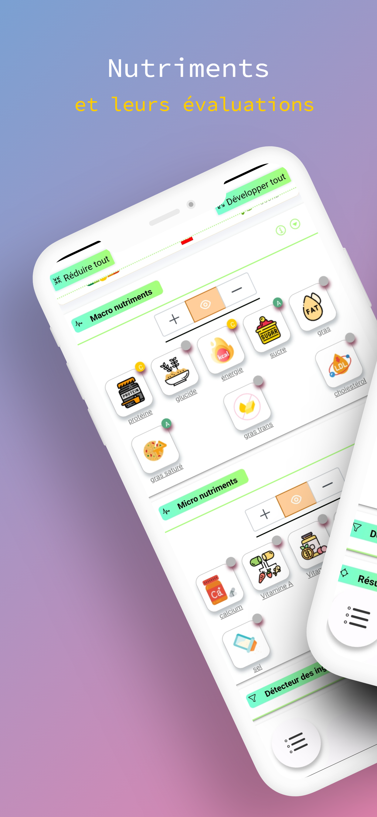 Évaluation rapide de chaque nutriment par des indices colorés. Filtrage par rapport aux points positifs et négatifs du produit. Chaque nutriment est attribué à une évaluation selon les standards, s’il est bon ou non, et d’autres surprises.