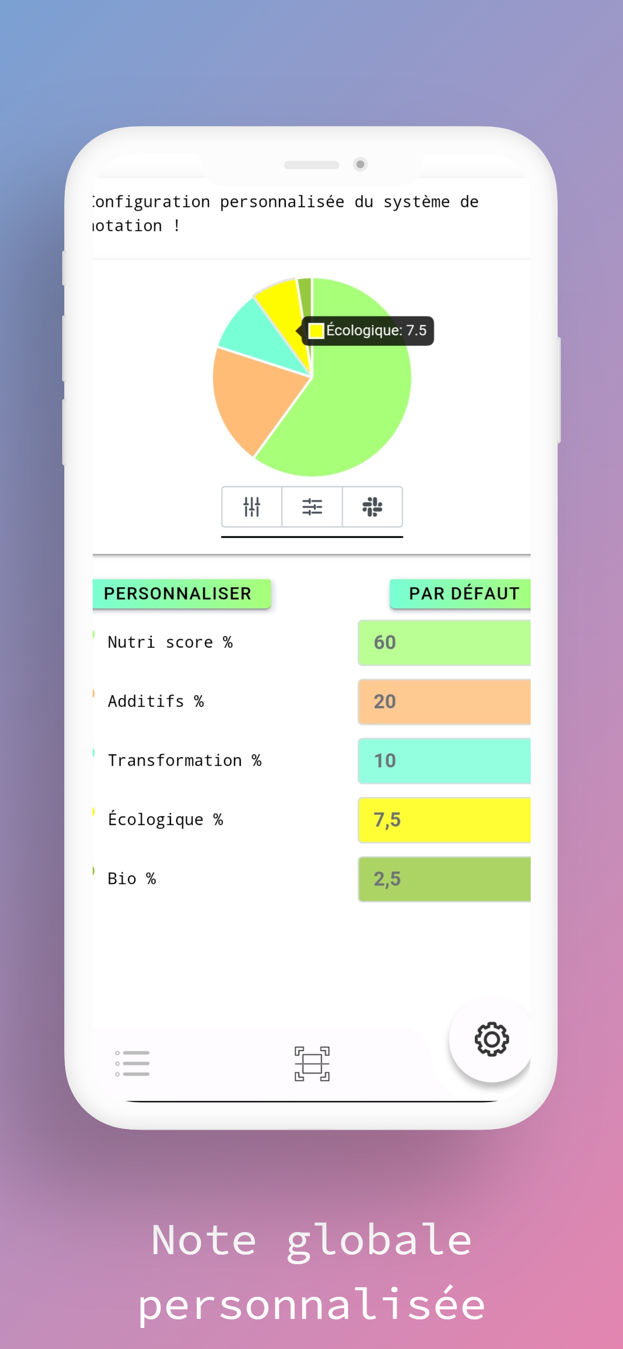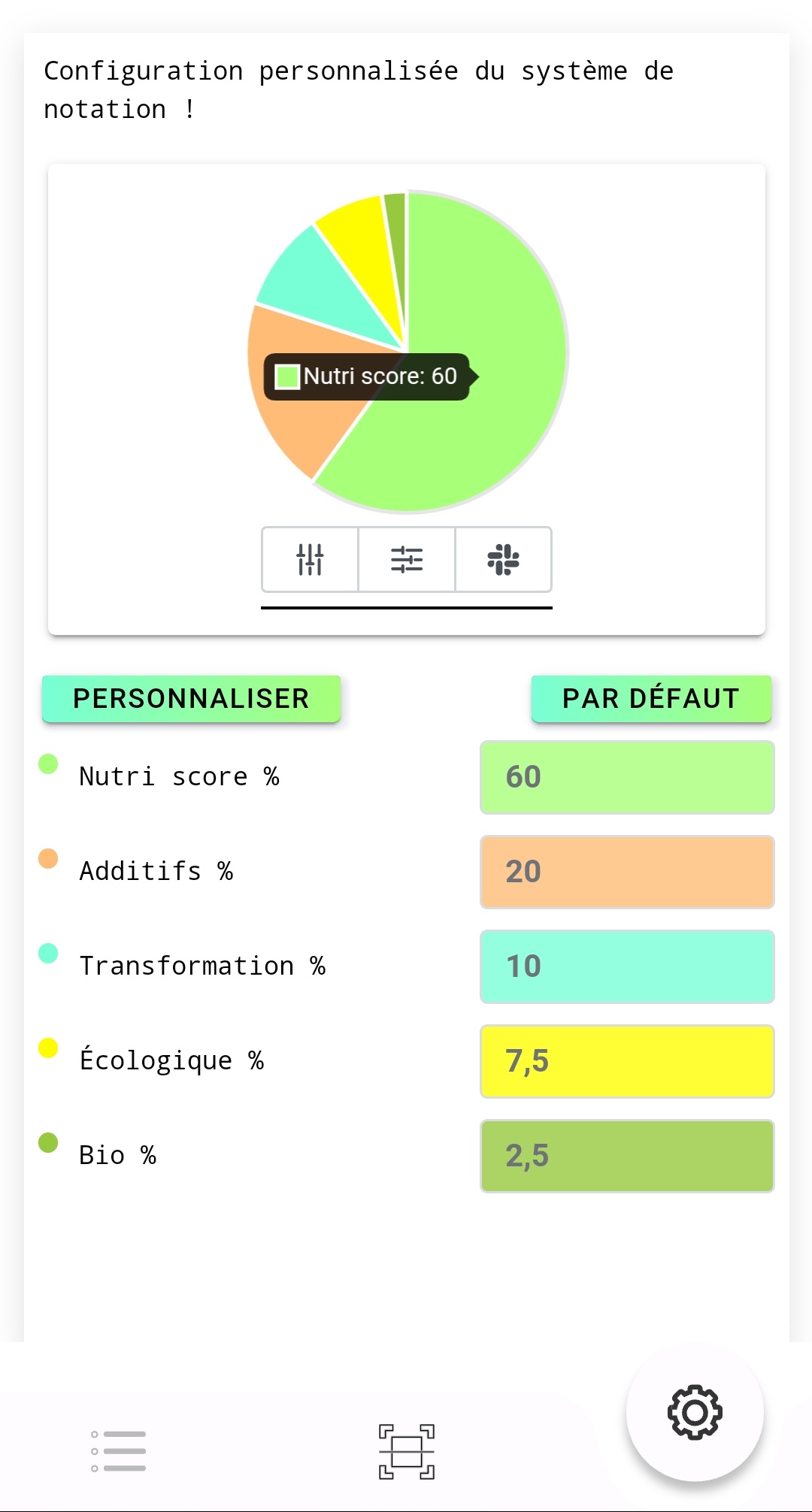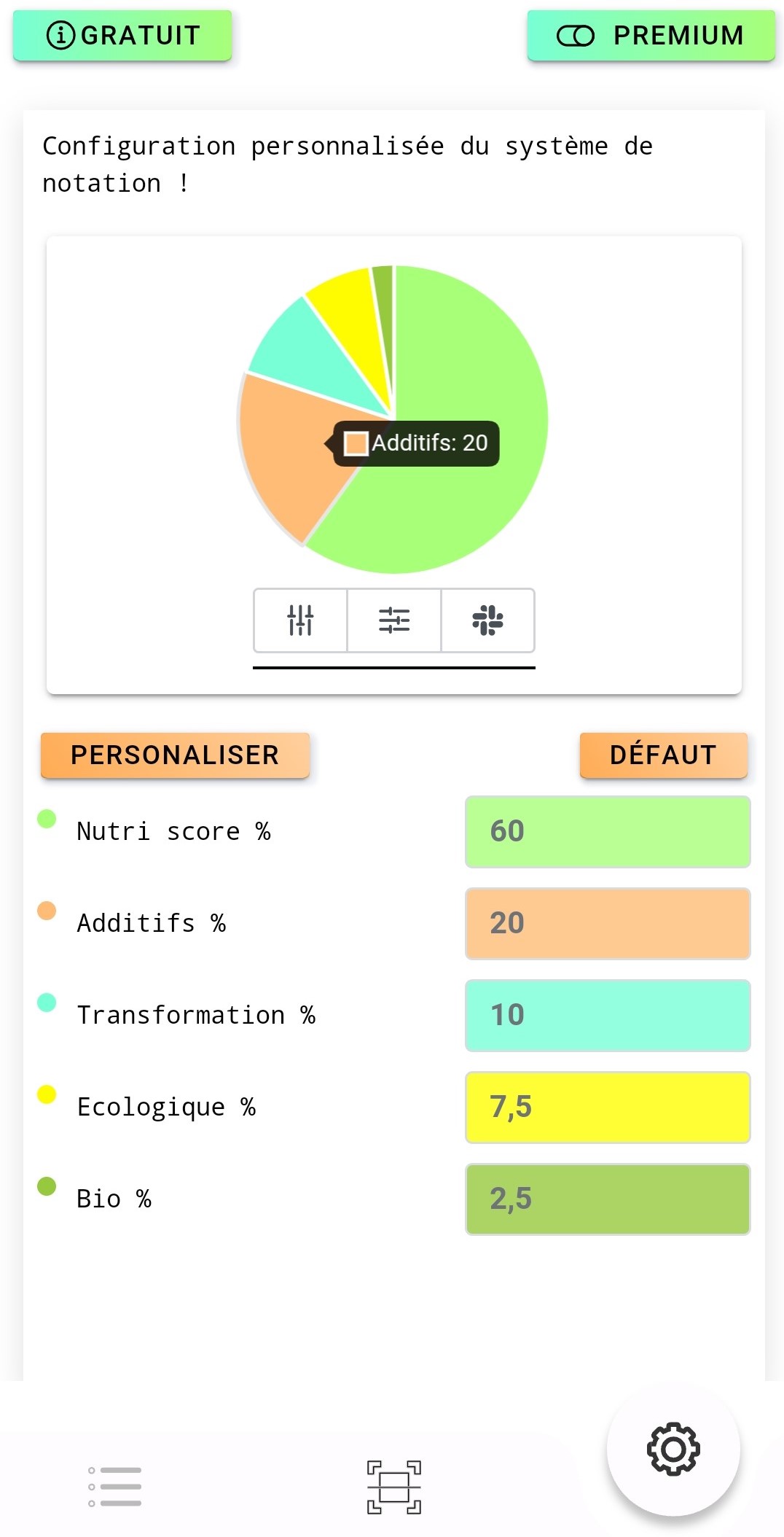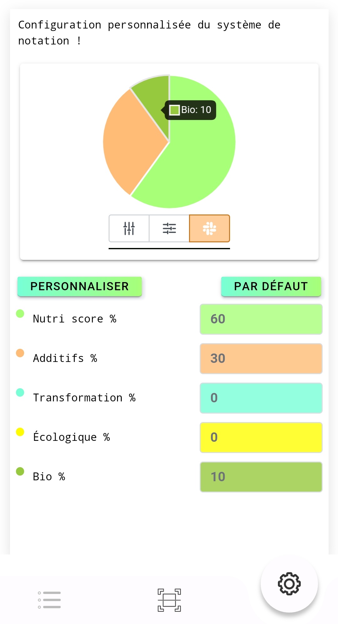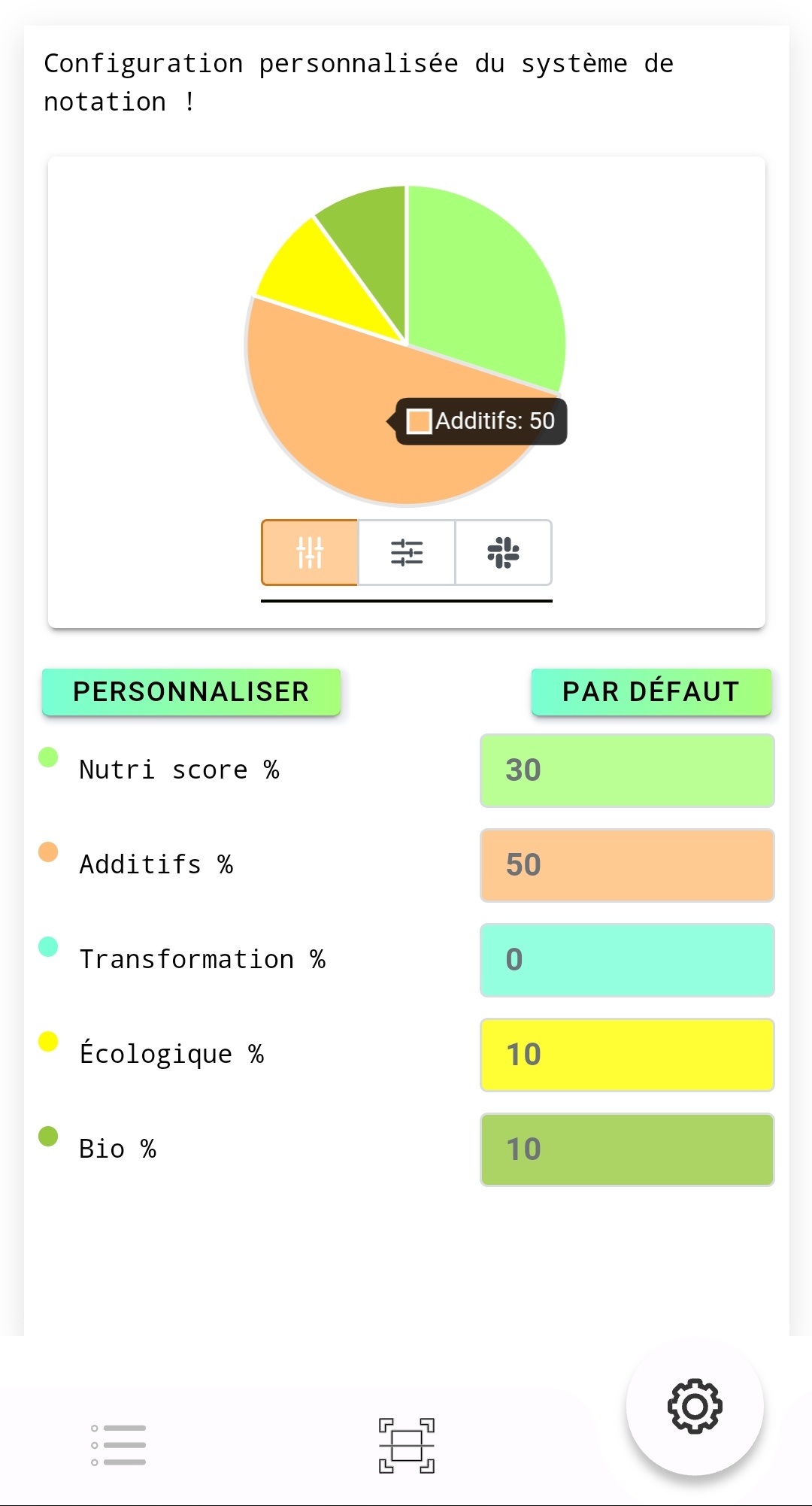 Solution : ZigZag, c’est la méthode de notation des produits alimentaires qui se base sur cinq critères : (Nutri-score, Additifs alimentaires, Indice de transformation, Indice pour l’environnement, dimension biologique). Vous pouvez changer les pourcentages de chacun de ces critères. L’application suggère déjà 4 exemples de notations dans l'onglet configuration.