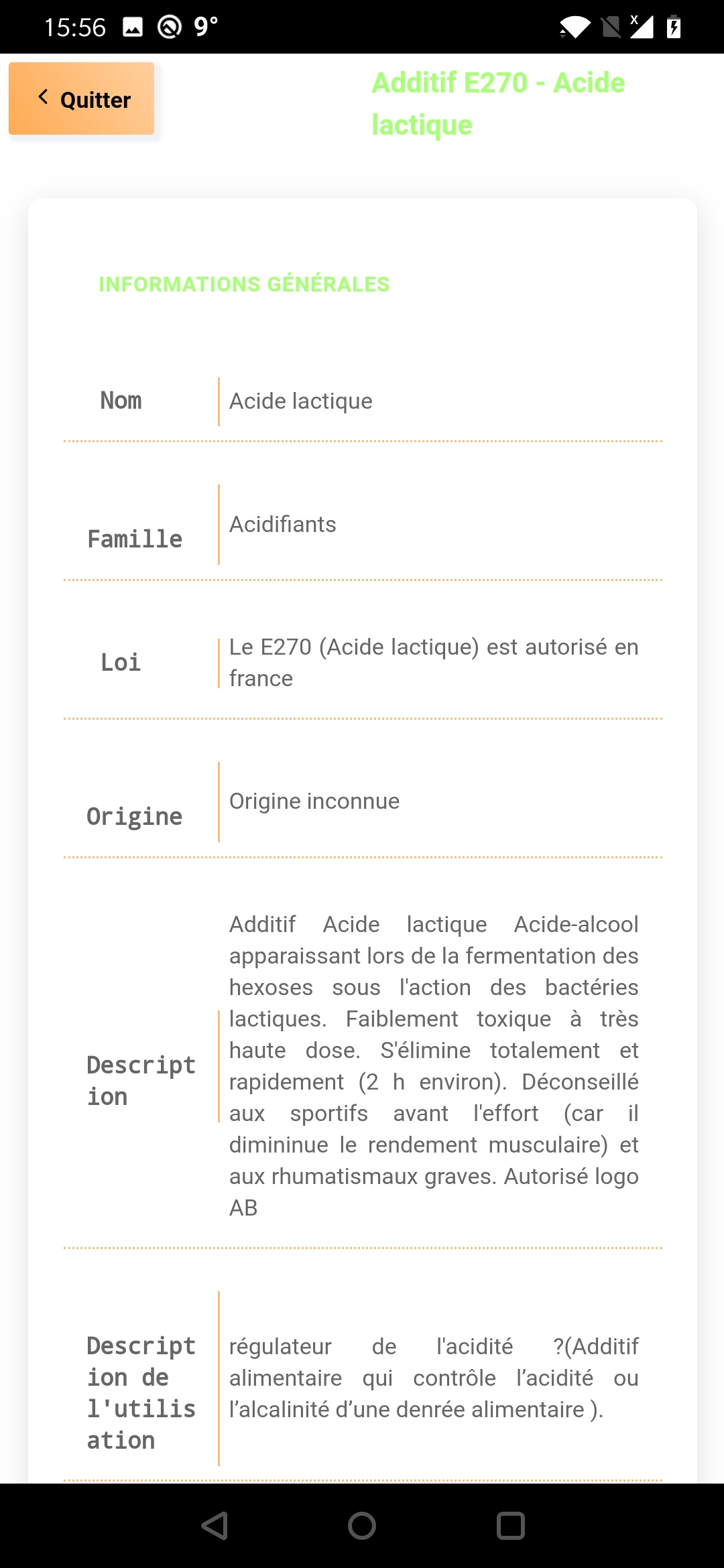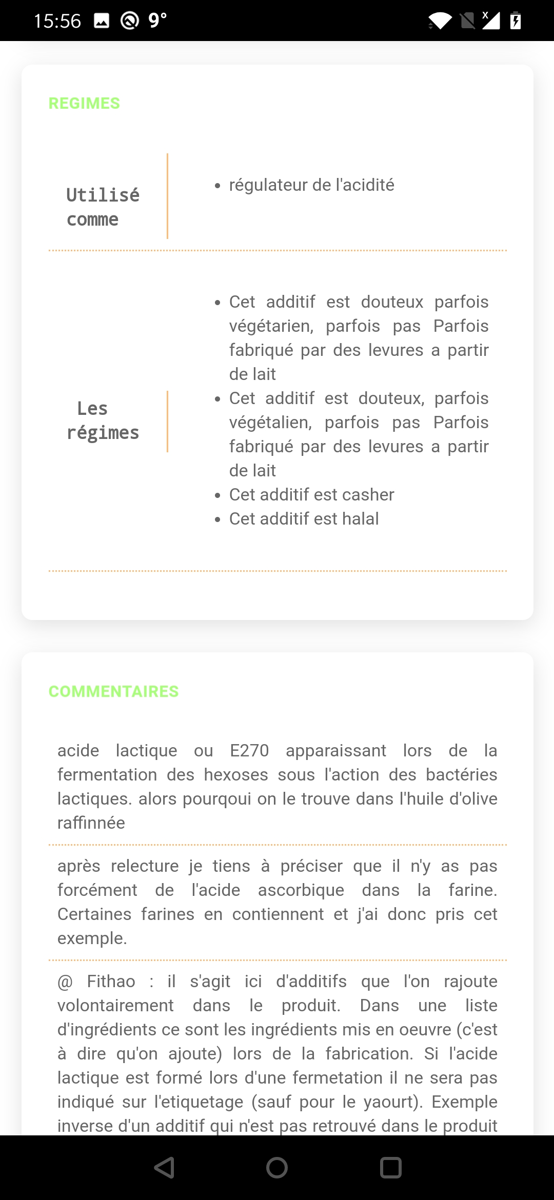 Plusieurs informations sur l'additif : l'évaluation de son risque, son type, sa famille, les commentaires d'autres utilisateurs et bien plus ....